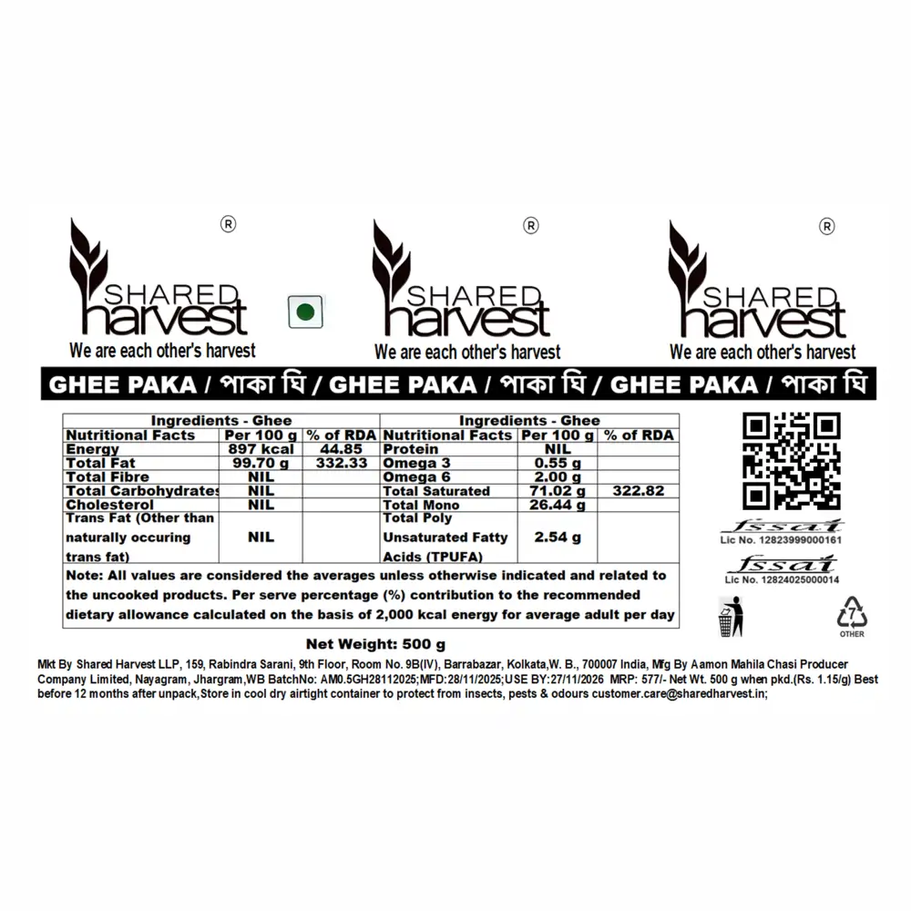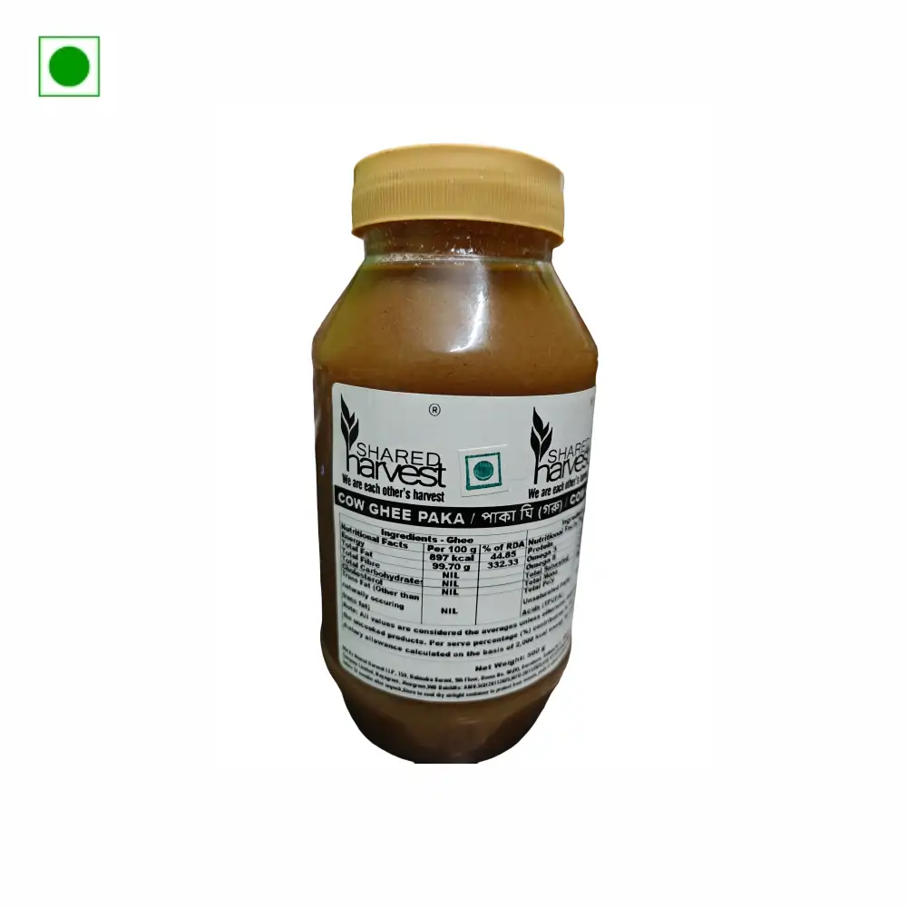 Shared Harvest Cow Ghee (Paka Ghee) is a premium, traditionally prepared clarified butter made from pure cow’s milk. Slow-cooked, it delivers a rich, golden colour, a grainy texture, and an authentic aroma — perfect for cooking, rituals, and daily nutrition.