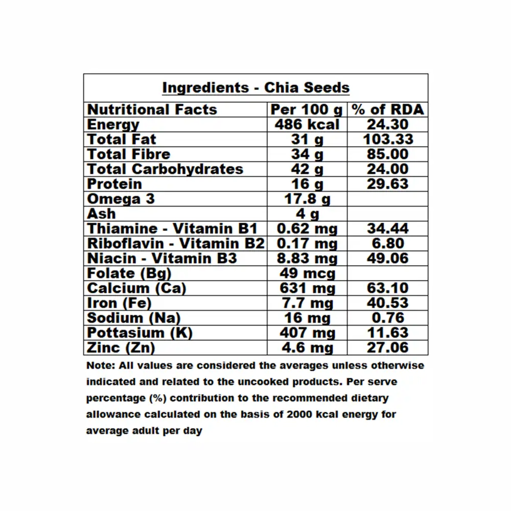 Allergen Information: Chia seeds are not a common allergen, but allergies can occur, and individuals with known allergies to sesame seeds or other mint family (Lamiaceae) herbs should be cautious due to potential cross-reactivity. Allergic reactions can range from mild symptoms like hives, itching, or swelling to more severe issues like difficulty breathing. It is recommended to consult a healthcare provider before introducing chia seeds if you have pre-existing seed allergies, and to start with a small amount if introducing them for the first time.