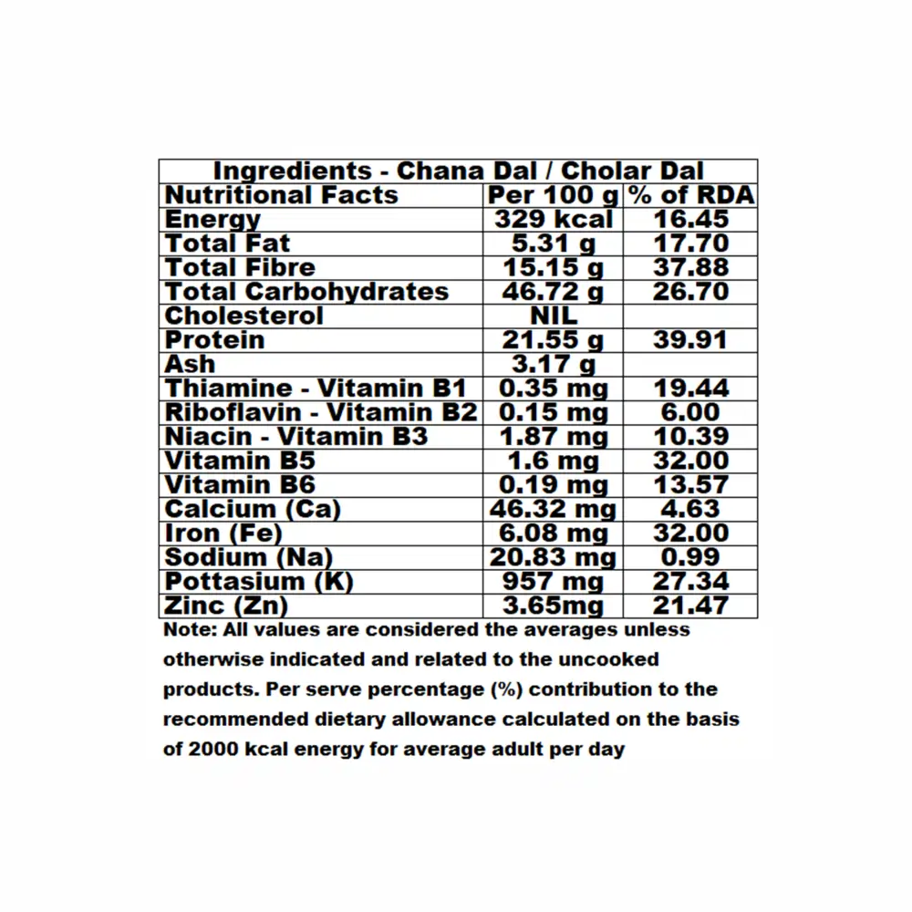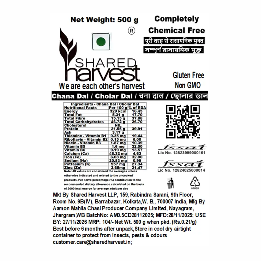 Benefits: Shared Harvest Chana dal provides numerous health benefits, including being a great source of protein and fibre, which supports muscle health, aids digestion, and helps manage weight. It is also beneficial for heart health by helping to regulate blood pressure and cholesterol, and can help control blood sugar levels due to its low glycaemic index. Additionally, it provides essential vitamins and minerals like B vitamins, iron, phosphorus, and magnesium that support body energy, bone strength, and immune function.
