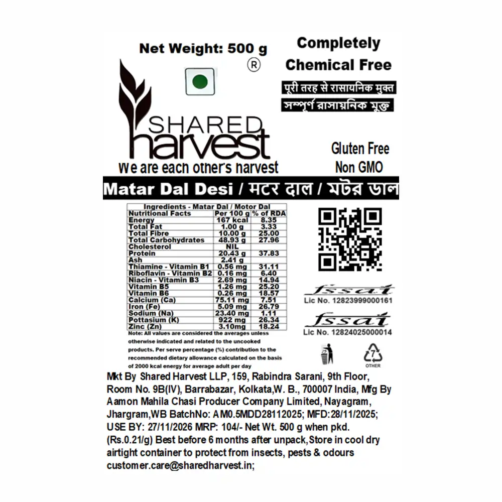 Benefits: Shared Harvest Matar dal, or Motor Dal or Yellow peas, offers numerous health benefits, including being a great source of plant-based protein and fibre, which aids in weight management and promotes digestive health. It is also rich in vitamins, minerals, and antioxidants that support heart health, blood sugar regulation, and bone health.