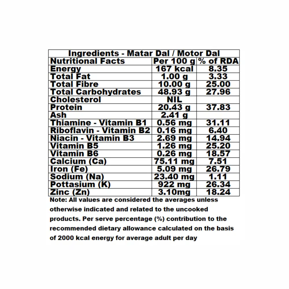 Yellow Matar Dal or Motor Dal is a legume, and its primary allergen is legumes, specifically the pea family (𝑃𝑖𝑠𝑢𝑚 𝑠𝑎𝑡𝑖𝑣𝑢𝑚). Individuals with a pea allergy or a general legume allergy should avoid it.