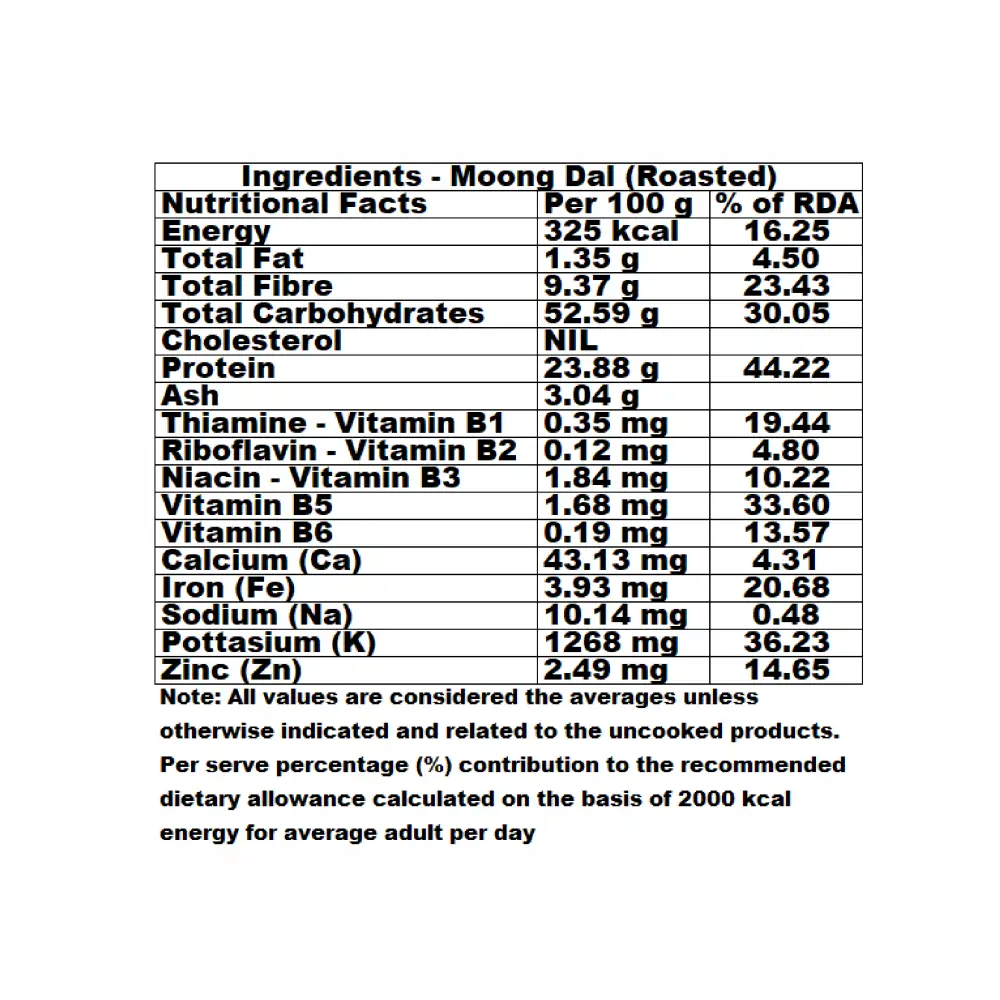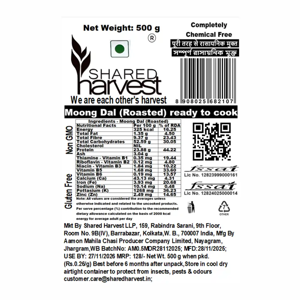 Benefits: Shared Harvest Roasted yellow split moong dal is a nutritious food that offers benefits for heart health, digestion, and weight management due to its high fibre and protein content. It is rich in vitamins and minerals like folate, iron, potassium, and magnesium, and also contains antioxidants, making it a good choice for vegetarians and vegans.