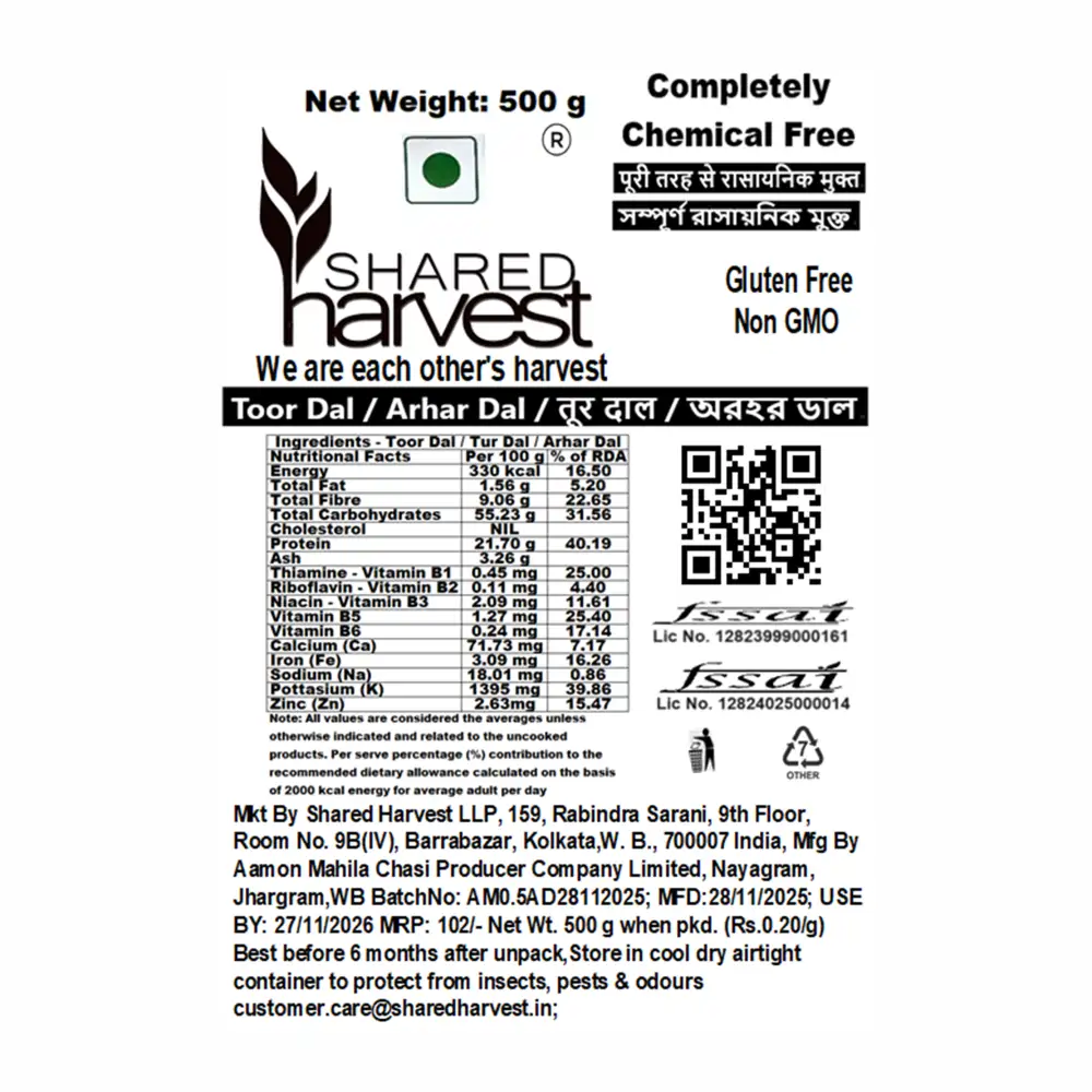 Shared Harvest Unpolished Arhar Dal / Toor Dal benefits include being a rich source of plant-based protein for muscle health, high in fibre to aid digestion and weight management, and containing antioxidants that can help regulate blood sugar and improve heart health. It is also a good source of folate, which is crucial for pregnant women, and provides various other vitamins and minerals that boost energy and overall well-being