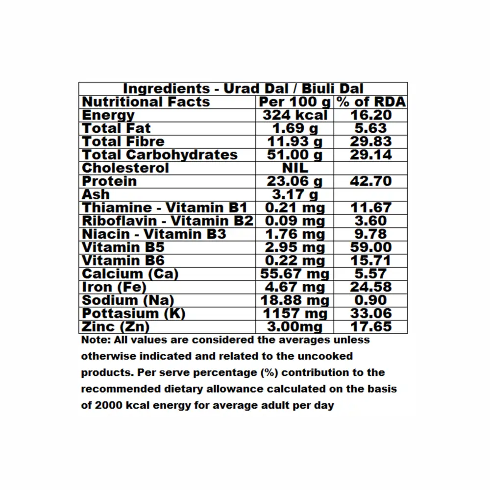 Allergen Information: Urad dal is naturally gluten-free and allergen-free in its pure form, meaning it is safe for those with gluten intolerance or wheat allergies. Additionally, urad dal can trigger certain side effects for some individuals, such as digestive issues, bloating, or allergic reactions like urticaria, and is not recommended for people with high uric acid levels or certain kidney diseases.