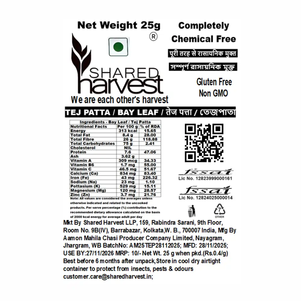 Add a touch of aroma and warmth to your cooking with Shared Harvest Tej Pata, also known as Indian Bay Leaf. Handpicked from the finest farms, our Tej Pata brings a subtle yet distinct flavour to curries, biryanis, soups, and stews.