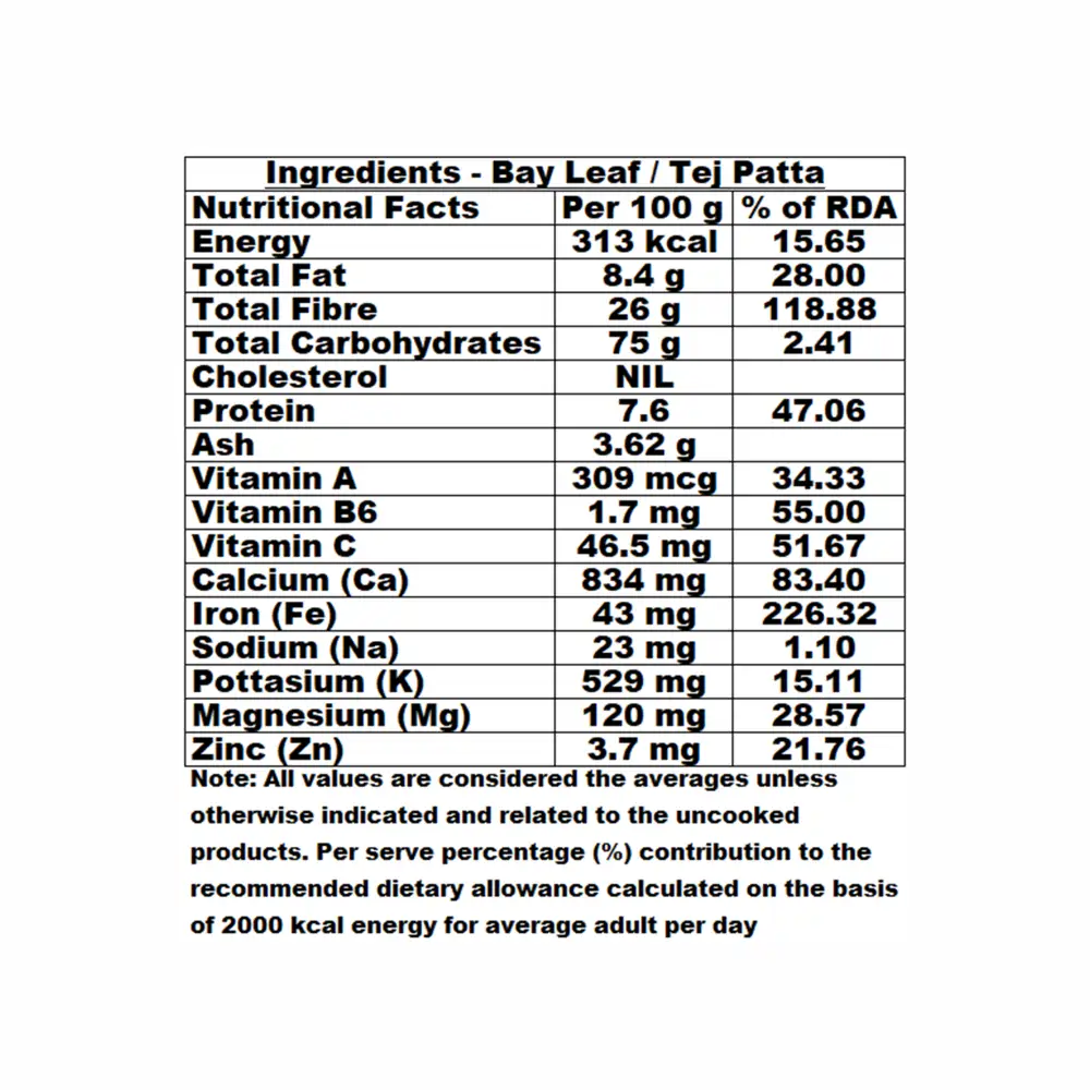 Allergen Information: Tej Patta (Indian bay leaf) can cause allergic reactions, including skin rashes or breathing problems, in some individuals. It may also cause skin irritation, and people with a pre-existing allergy should use it with caution. The allergenic potential is higher with external applications of tej patta oil, and caution is advised when using it externally or consuming it in large amounts