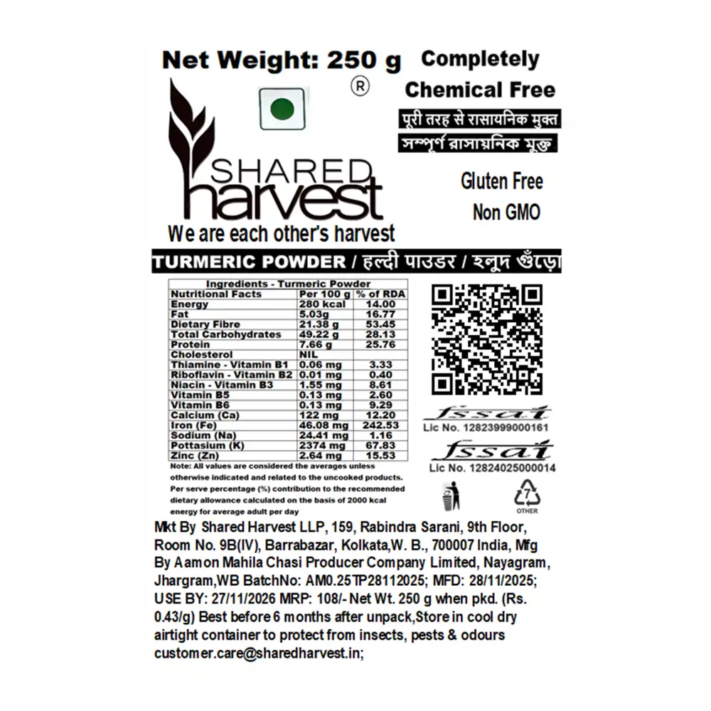 Benefits: Shared Harvest Turmeric / Haldi Powder is completely chemical free belongs in your spice essentials. Known to have powerful anti-inflammatory and antioxidant benefits, it has a reputation in boosting the immune system.