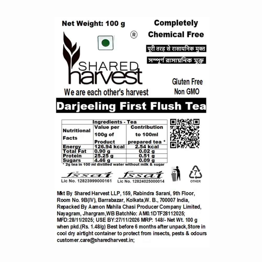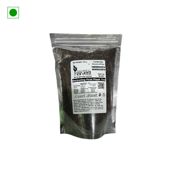 Shared Harvest Darjeeling First Flush Tea leaves are sourced from renowned Darjeeling estates, ensuring freshness, purity, and authentic mountain flavour.